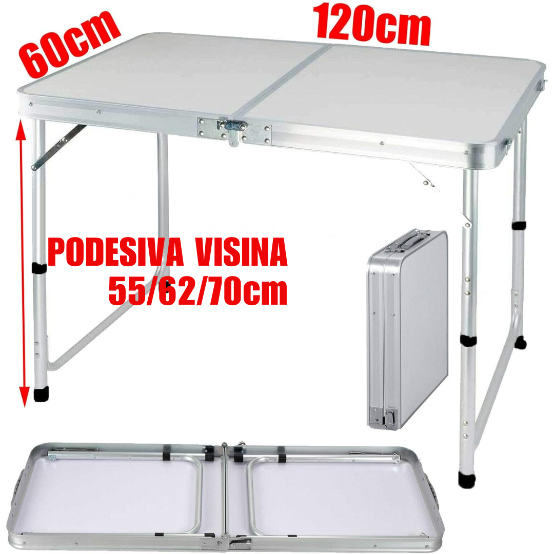 Podesiva visina (70/62/55 cm) omogućava da sto prilagodite različitim potrebama i korisnicima. Lako se sklapa i rasklapa, a integrisana ručka za nošenje čini ga izuzetno pogodnim za transport i skladištenje.